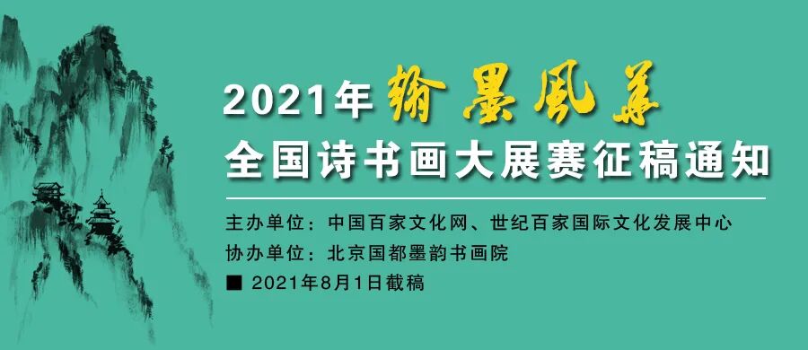 妙笔书盛世,翰墨展风华。为弘扬中华民族优秀的传统文化,展现我国传统诗书画艺术在新时代所取得的可喜成就,喜迎新中国成立72周年,特举办2021年“翰墨风华”全国诗书画大展赛。大展赛由中国百家文化网、世纪百家国际文化发展中心主办,北京国都墨韵书画院协办,即日起面向全社会征稿。一、征稿对象:年满18周岁的诗书画家及爱好者。二、征稿内容:1、诗词类:古体诗词1-5首,须合辙押韵,符合格律要求。新诗1-2首,且不超过80行,谢绝组诗。欢迎通过电子邮箱:hmfh666@163.com 投稿,发送时请勿使用附件。2、书画类:书法作品(含硬笔)书体不限,不收册页、对联、多条屏,草书、篆书需附释文。绘画作品画种不限。书画无需装裱,尺寸不限,作品背面右下角请用铅笔注明姓名及通联方式。原作优先评审,也可发送高清晰的作品照片(不小于1M,不大于10M,JPG格式,印章清晰可辨)。三、参评要求:1、所有来稿请附纸注明作者姓名、年龄、地址、邮编、电话及简历。2、每人限寄一种作品,多寄无效,发表与否均可。所有来稿均不退稿。四、作品评选:1.由著名诗人、书画家、评论家等组成评委会,视作品质量按一定比例评选出一、二、三等奖和优秀奖等,免费寄发获奖证书。2.组委会将向获奖艺术家专函寄发通知,邀请获奖艺术家参加隆重的颁奖典礼、创作笔会、名家讲座、学术研讨会、景区采风等系列活动。五、温馨提示:1、本次大展赛不收参赛费、通联费、评审费。2、大展赛截稿日期为2021年8月1日(以发稿时间为准)。 收件地址:(100040)北京市石景山区40局88信箱大展赛组委会 收件人:郑芳 办公电话:010-68638281 15210967176 电子邮箱:hmfh666@163.com 官方网站:中国百家文化网